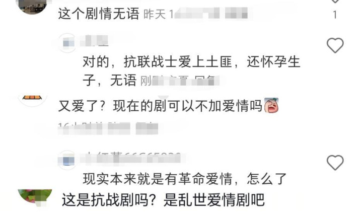 看到这样的情节,很多网友都觉得看不下去了,有的说:“这是抗战剧吗?是乱世爱情剧吧?”有的说:“又爱了?可以不加爱情吗?”还有的说:“弃剧了,这样的爱情戏份意义在哪儿?”但是也有网友表示:“现实本来就有革命爱情,怎么了?”