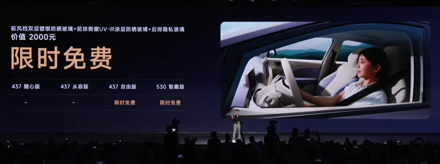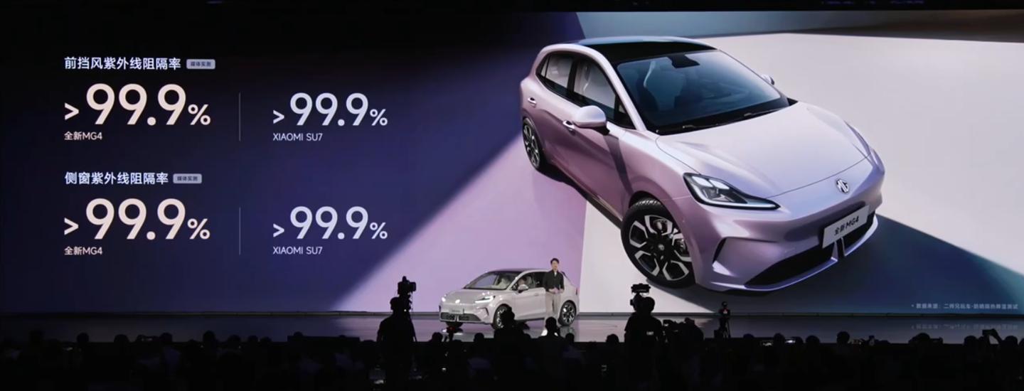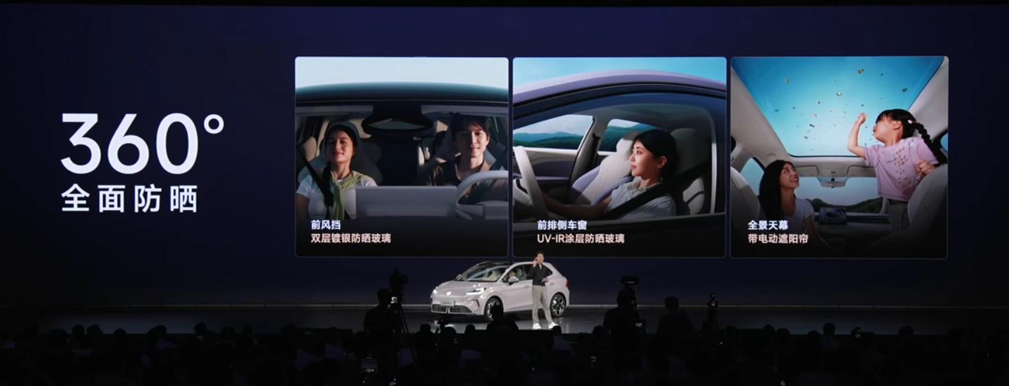 新车支持 360° 全面防晒,前风挡双层镀银防晒玻璃 + 前排侧车窗 UV-IR 涂层防晒玻璃 + 全景天幕带电动遮阳帘,前风挡紫外线阻隔率 99.9%,侧窗紫外线阻隔率 99.9%;拥有同级唯一后排配备行政轿车隐私玻璃:可见光阻隔率 78%(市面普通绿波玻璃 25.9%),呵护乘坐在二排的孩子的视力健康。