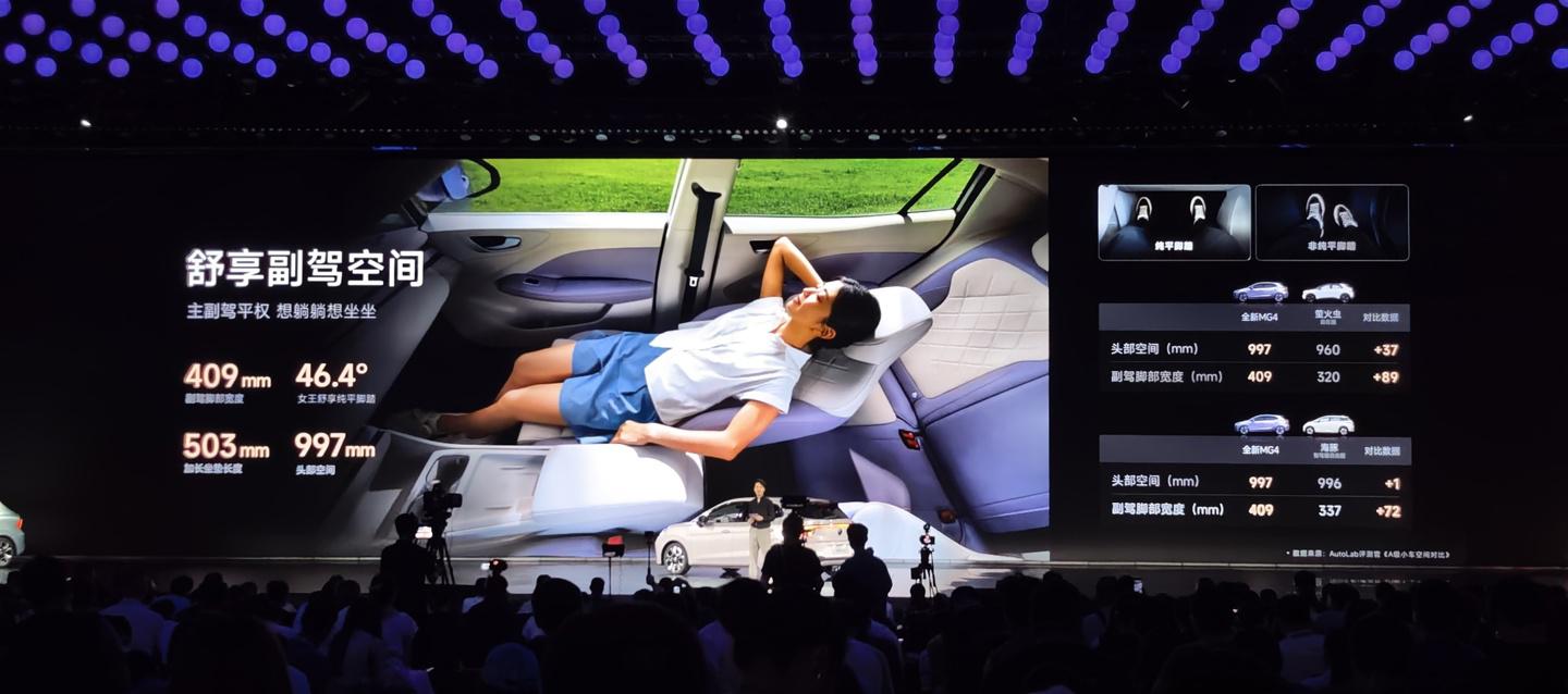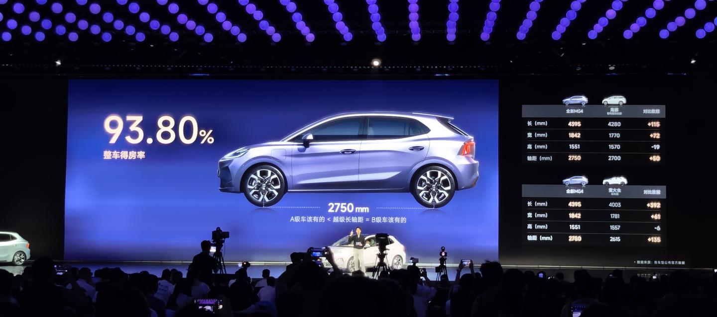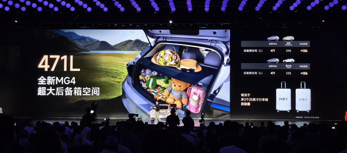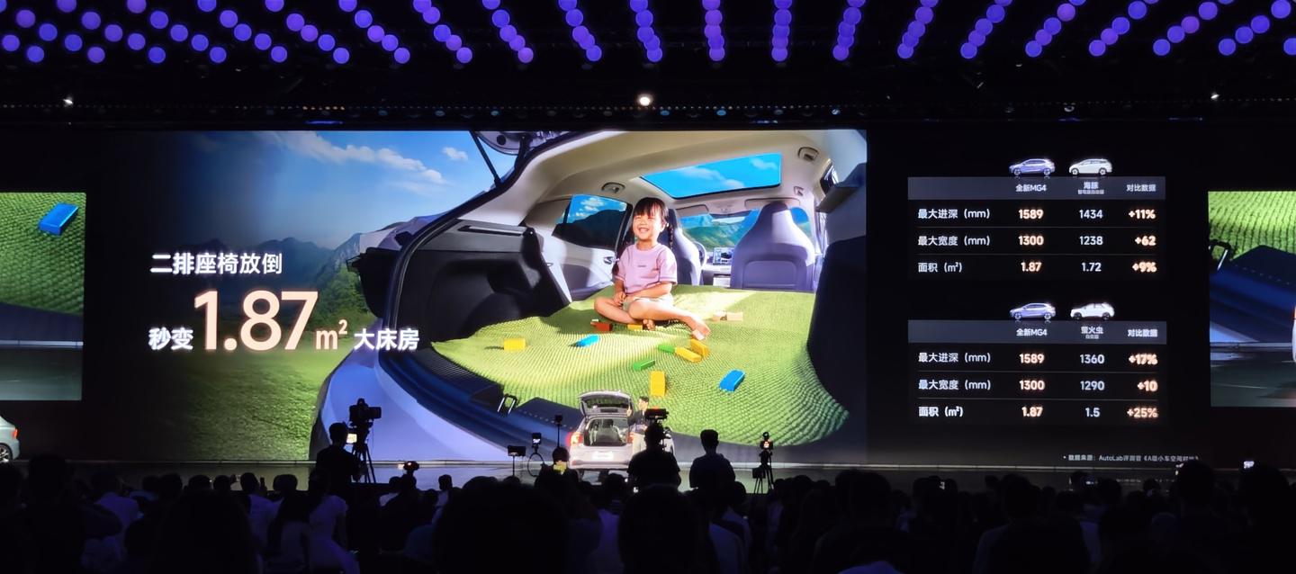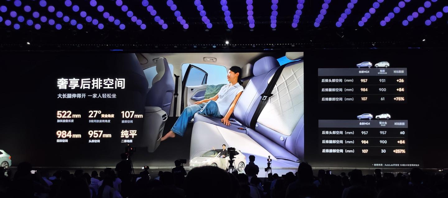 上汽名爵全新 MG4 汽车长宽高分别为 4395×1842×1551mm、同级最长轴距 2750mm,整车得房率 93.8%,拥有 471L 后备箱空间、98L 下沉储物空间,二排座椅放倒可变 1.87m 大床房。新车副驾腿部宽度 409mm,女王舒享纯平脚踏 46.4°,同级最长坐垫长度 503mm。