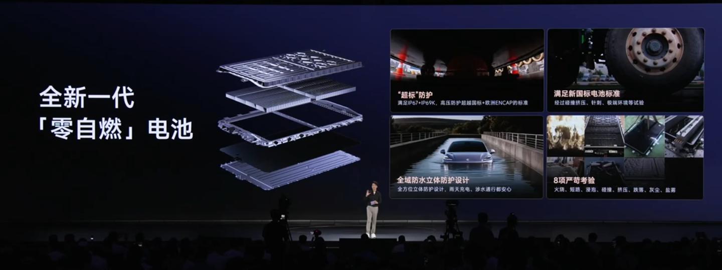 全新一代“零自燃”电池:向车主承诺三电终身质保,满足 IP67+IP69K,高压防护超越国标 + 欧洲 ENCAP 的标准,通过抗火烧、短路、浸泡、碰撞、挤压、跌落、灰尘、盐雾 8 项考验